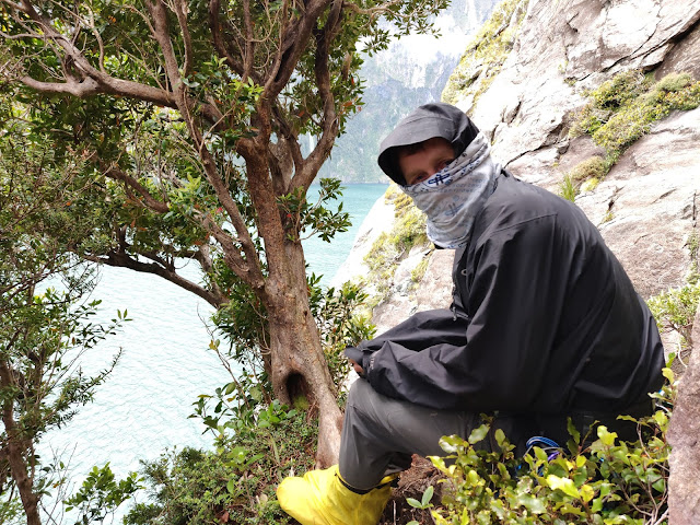 We were on the water early. It was a calm and glorious day. This serenity was shattered by the aggressive Sinbad gully sandflies. Onwards, upwards - full of sandfly induced fury we charged into the bush.